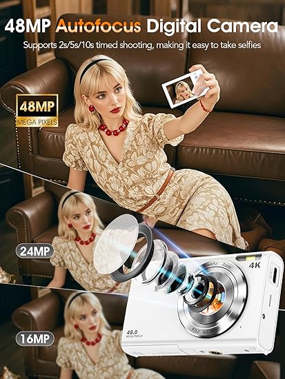- This compact digital camera features the latest CMOS sensor system, supporting 4K video recording and 48MP high-resolution photos. Whether you’re exploring the beauty of nature or capturing the joy of a family gathering, this camera ensures you can clearly document every important moment in stunning detail.